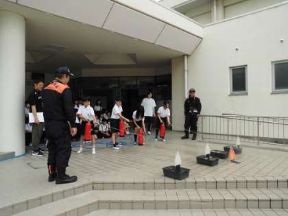 初期消火体験では、水消火器を使い消火体験を行い、消火器の基本的な使い方を学びました。