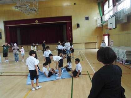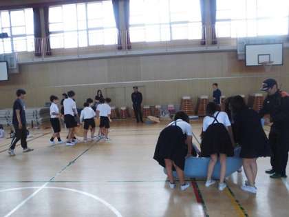 負傷者搬送訓練では、負傷者が発生した場合に、身近なものを使用して搬送する方法を学びました。今回は毛布を使用して簡易担架を作成しました。