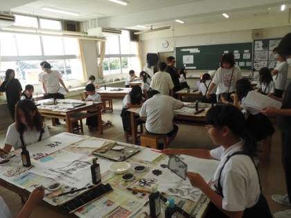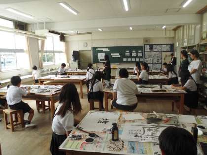 今日は、6年生の研究授業がありました。「墨と自ら広がる世界」の学習をしました。墨での表現でできる効果を活かし、友だちとの交流を通し工夫を加え、楽しく活動に取り組んでいました。