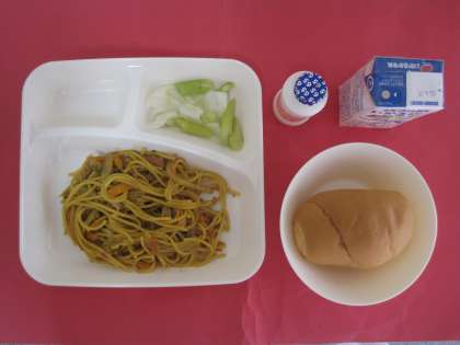 豚ひき肉、ベーコン、たまねぎ、にんじん、缶詰めのトマト、ピーマンを炒め、塩、カレールウの素(米粉)、濃口しょうゆで味つけし、最後にゆでたスパゲッティを加えて炒め合わせたカレースパゲッティです。