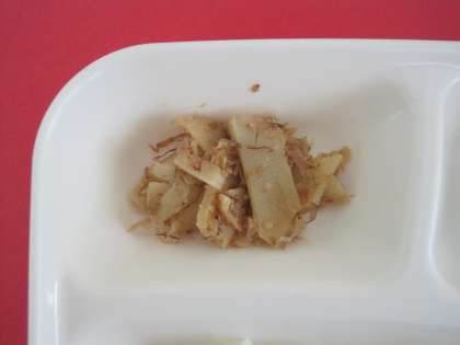 たけのこをいためて、しょうゆ、みりんで味つけし、ごまとかつおを