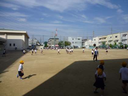 いいお天気の昼休み、多くの児童が、運動場で元気に遊んでいます。