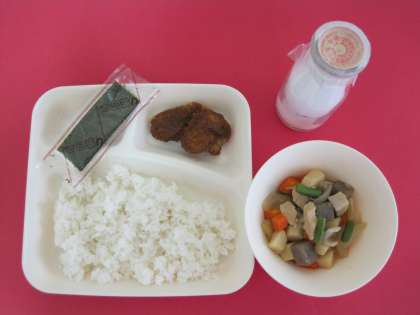 鶏肉とたけのこ、れんこんなどの野菜を煮た和風の煮ものと焼きのりです。
