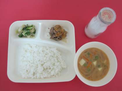 とうふ、たまねぎ、にんじん、三度豆を使ったみそ汁とツナ、キャ