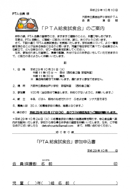 10月31日(火)開催の「PTA給食試食会」の参加者を