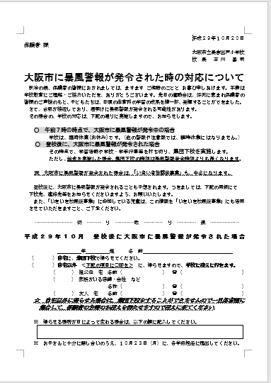 「大阪市に暴風警報が発令された時の対応について」の手紙を、
