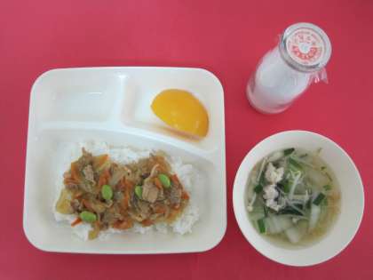 鶏肉、はくさい、もやし、にら、えのきたけを使ったスープと黄桃の