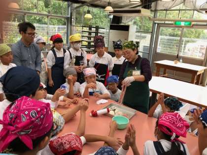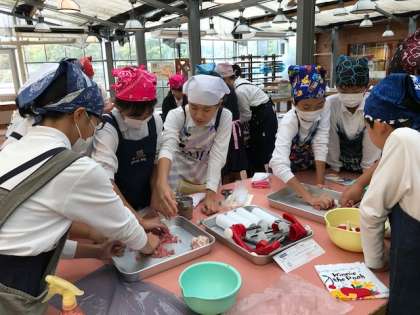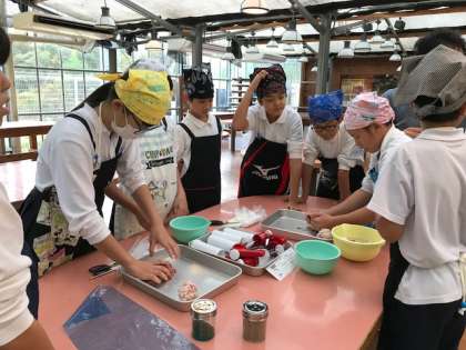 修学旅行 最初の活動は、「ウィンナーソーセージ作り」です。