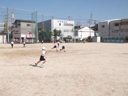 雲一つない青空の下で、かけっこの学習をしました。