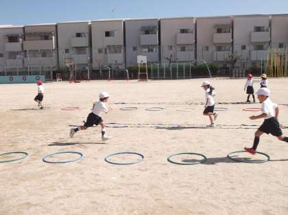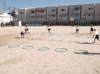 フープを使った歩幅を大きくして走る学習をしました。