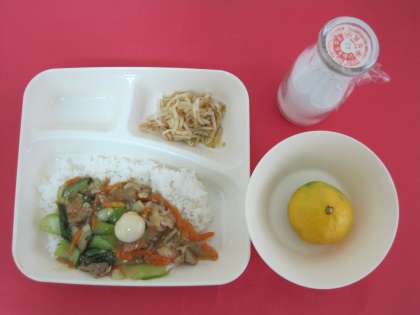 うずら卵の入った中華丼です。うずら卵にアレルギーのある児童は、