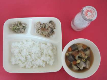 和風の煮ものときゅうりと切り干しだいこんを赤じそ、砂糖、酢、うす口
