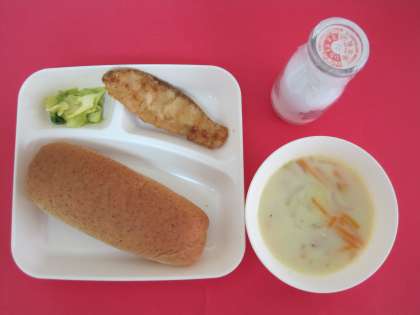豆乳を使ったコーンスープとキャベツをカレー味でいため物にしました。