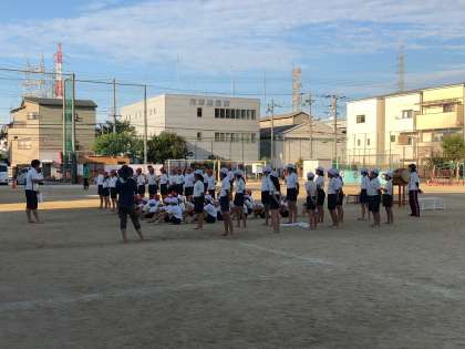 放課後に残って練習しています。写真の様子は、校舎に向かって発声練習をしているところです。