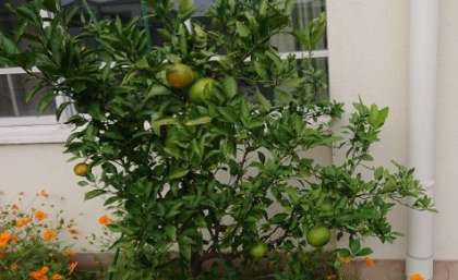 キバナコスモスという花です。隣に、ミカンの木がありました。