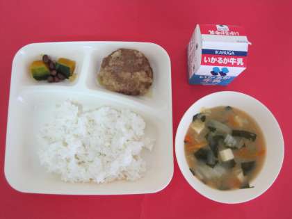 とうふ、たまねぎ、はくさい、にんじん、わかめを使ったみそ汁とかぼ