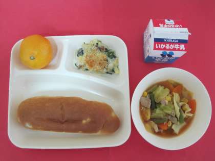 ほうれん草を使ったマカロニグラタンと季節のみかんです。