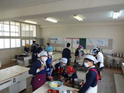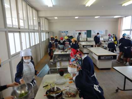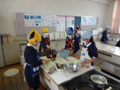 11月14日(水)、15日(木)、16日(金)の三日間に分かれて、家庭科(調理実習)では、「焼きそば&コンソメスープ」を作りました。食材を慎重に切り分け、一生懸命協力して作り上げました。