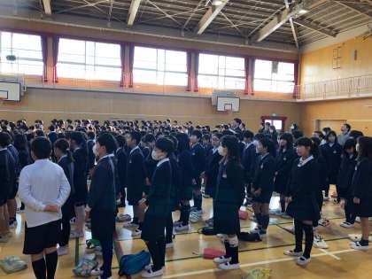 今日は始業式がありました。子どもたちは冬休みの宿題や荷物を持って登校しました。始業式では、校長先生から転入生の紹介がありました。最後に校歌の1・4番を歌いました。