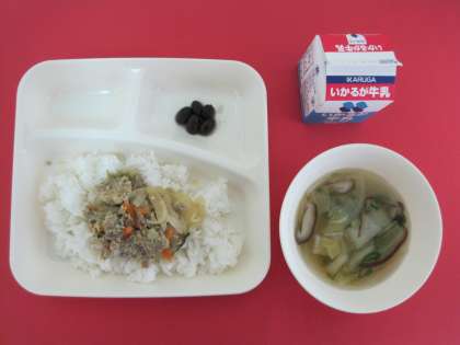 アレルギーのある児童は、卵でとじる前に取り分けたものを食べました。