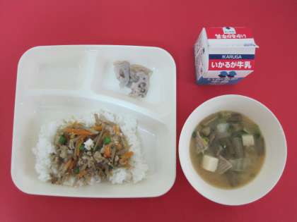 グリンピースといため合わせ、少しのだしで煮ました。ご飯にかけて、