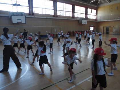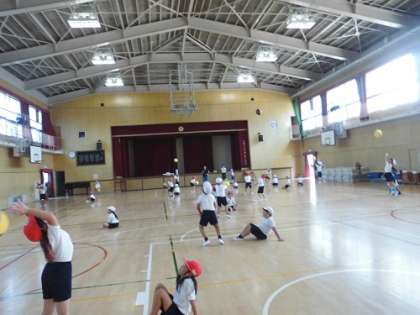 体育の学習で、ボール投げの練習をしています。紙鉄砲を使って投げる練習をしています。紙鉄砲の動きがボールを投げる動きにつながります。体育館に大きな紙鉄砲の音を響かせていました。運動会の玉入れに向けての取り組みの1つです。