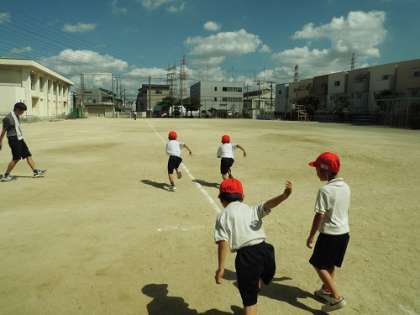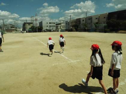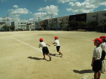 体育の学習です。運動会に向けて50メートル走のタイムを計っています。ゴールめがけて一生懸命に走っていました。