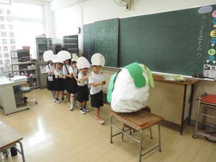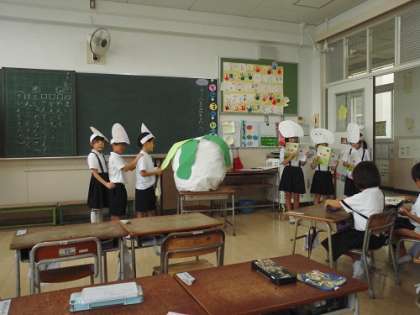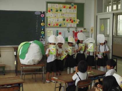 国語科の学習です。「おおきなかぶ」の音読発表会をしました。動作を交え、みんなで声をそろえて「うんとこしょ、どっこいしょ。」