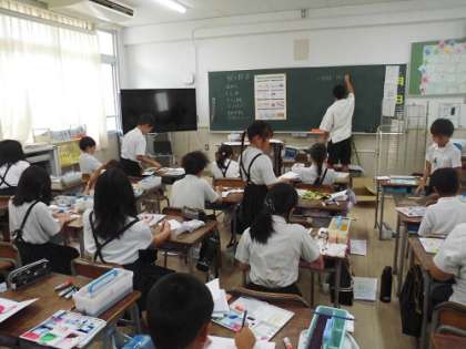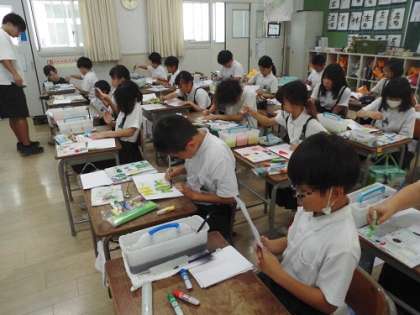 図画工作の学習です。「にじみ」、「ドリッピング」、「デカルゴマニー」など、絵の具を使ったいろいろな表し方を学んでいます。