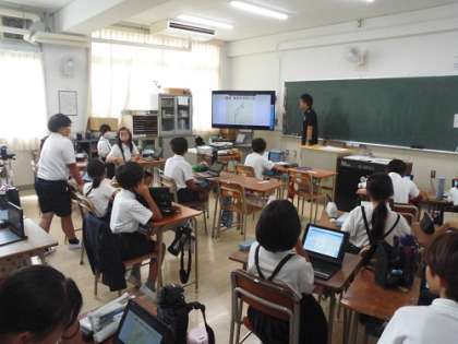 国語の「心の動きを短歌で表そう」の学習です。夏の思い出を短歌にしました。タブレットを使いクラス全員の作品を鑑賞しています。その中で、自分が一番いいと思った短歌について感想を発表しています。タブレットを使うことで、一度に全員の作品が鑑賞できます。
