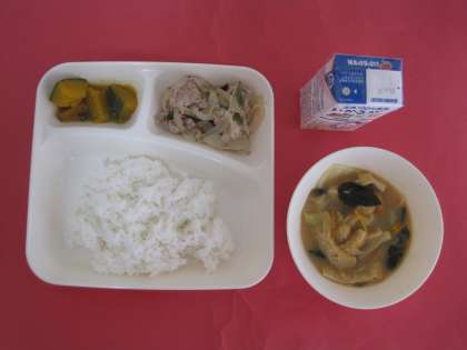 うすあげ、キャベツ、こまつな、にんじんを使ったみそ汁とあずきとかぼちゃを使ったいとこ煮です。