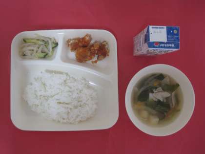 豚肉、とうふ、たまねぎ、チンゲンサイ、にんじんを使ったスープときゅうりと切干しだいこんを使ったナムルです。