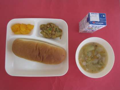 豚肉、じゃがいも、キャベツ、にんじん、コーン、パセリを使ったスープと缶詰めのみかんです。