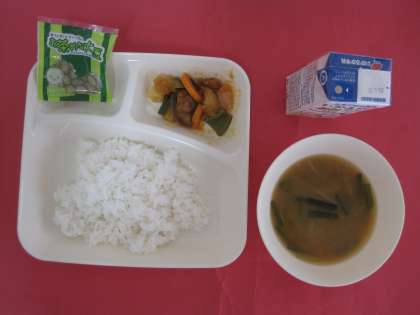 鶏肉、もやし、コーン、にら、しいたけを使ったみそ味のスープとまっ茶大豆です。