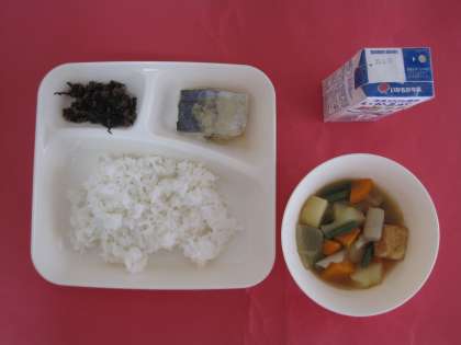 じゃがいも、つなこんにゃく、あつあげ、たまねぎ、にんじん、さんどまめを使った含め煮と牛ひき肉、しそ、ひじき炒めて、砂糖、みりん薄口しょうゆで味つけした牛ひじきそぼろです。