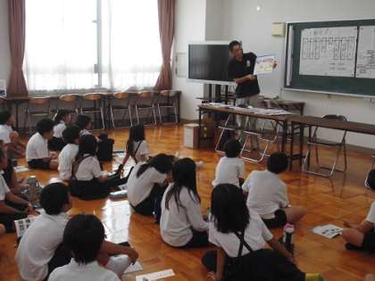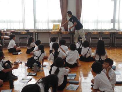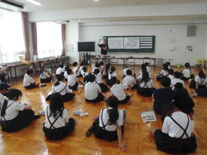 日本全国でどんなお米が作られているかを教えてもらったり、世界の米の生産量や米の種類を教えたてもらったりしました。お茶碗1杯のご飯の値段を考えるクイズもあり(お米5kgの値段を4000円として1杯52円になるそうです)、予想を大きく下回る値段の安さにびっくりしていました。また、茶碗1杯の米粒の数は、3520粒程度になるそうです。
