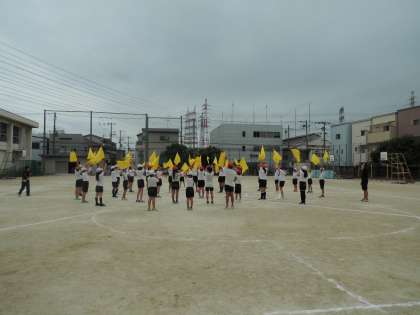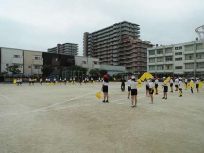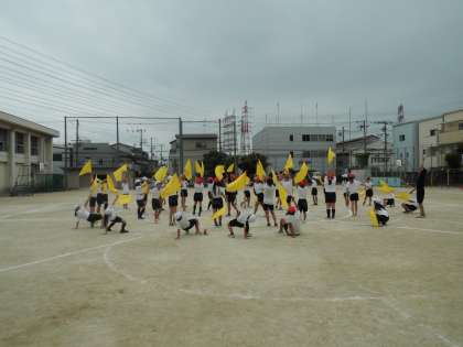 運動会の団体演技の練習です。初めて運動場で練習をしました。運動場での隊形や位置、動き方の確認などをしながら練習に励んでいました。