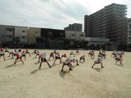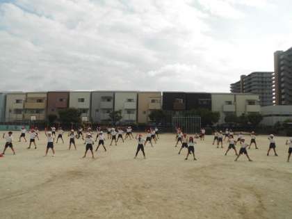 運動会の団体演技の練習です。運動場での初めての練習でしたが、運動場に響き渡る大きな掛け声で、きびきびとした動作で練習に励んでいました。