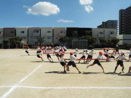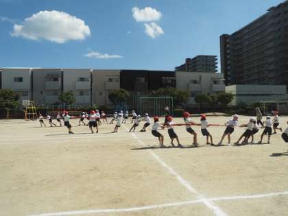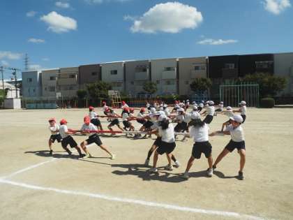 運動会の団体競技「棒引き」の練習です。本番に向け、チームで作戦を話し合い練習に励んでいました。