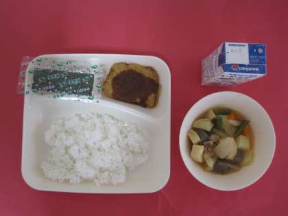 鶏肉、じゃがいも、こんにゃく、たまねぎ、たけのこ、にんじん、さんどまめを使った煮ものと焼きのりです。