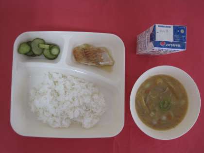豚肉、うすあげ、たまねぎ、はくさい、ごぼう、にんじん、白ねぎを使った豚汁ときゅうりの和え物です。