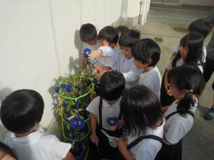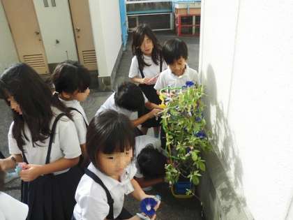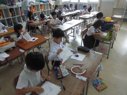 生活科の学習です。アサガオの花を摘み、押し花を作りました。水分を取り除き、重しをのせています。出来上がりが楽しみです。