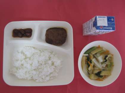 冷凍のハンバーグは焼き物機で焼きました。砂糖、みりん、濃口しょうゆ、湯を合わせて煮、水どきでんぷんでとろみをつけたたれを焼いたハンバーグにかけました。