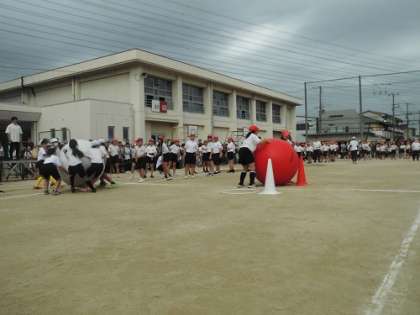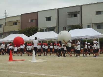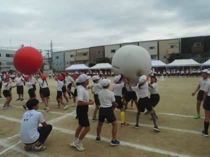 全学年、団体競技「みんなでつなごう!大玉おくり」です。