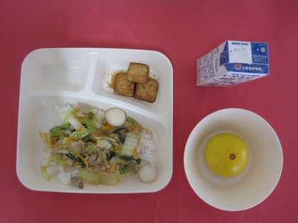 豚肉、うずら卵、はくさい、たまねぎ、たけのこ、にんじん、にら、しいたけをしょうがの香りを出した綿実油で炒め、湯を加えて煮、砂糖、塩、こしょう、濃口しょうゆ、中華スースの素で味つけし、水どきでんぷんでとろみをつけます。食べるときにごはんを盛りつけた上に具をかけて食べる中華丼です。卵にアレルギーのある児童は、うずら卵を入れる前に取り分けたものを食べました。