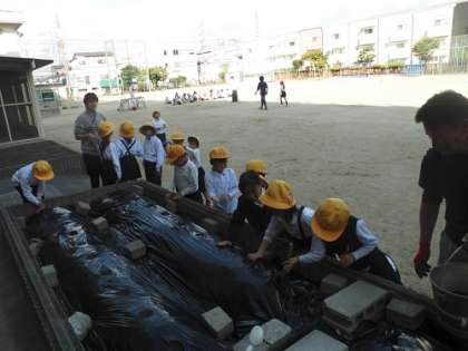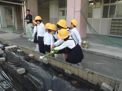 生活科の学習でダイコンを植えました。小さな種にそっと土をかぶせ、みんなで水やりをしました。