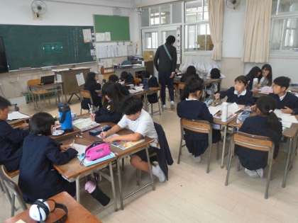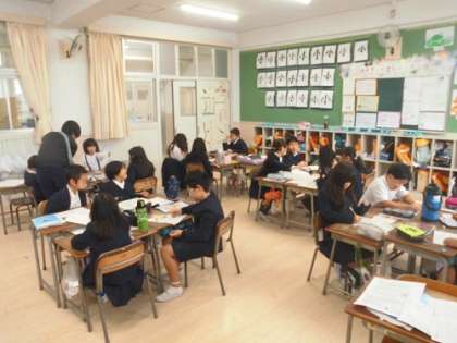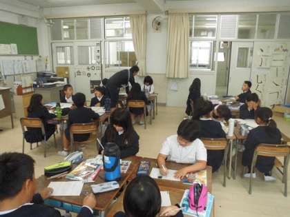 国語の学習です。情報を分けて整理するためにはどうしたらいいか、グループで話っています。どのグループも活発に意見交換していました。