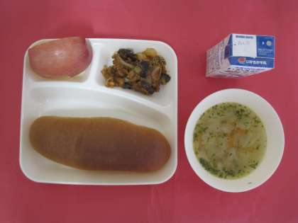 鶏肉、キャベツ、にんじん、パセリを使ったスープと季節のりんごです。