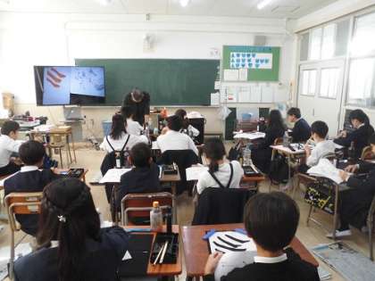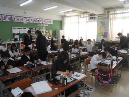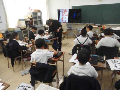 11月14日(金)、先月に引きつづき、著名な書道家の先生に来校いただき、5年生で書道出前授業を実施しました。縦画、横画、はねやはらいなど、筆の運び方を一つ一つていねいに教えていただきました。最後には「読む」という文字を書き、練習の成果を出すことができました。