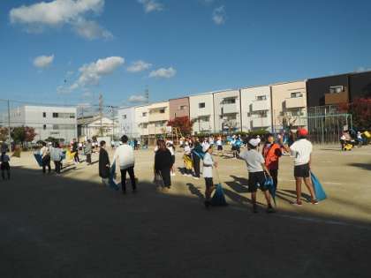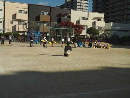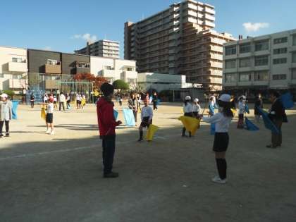 体育の学習です。保護者の方にも参加いただき、運動会のフラッグの表現運動をしました。運動会での演技をもとに保護者の方々と新しい動きを考え発表しました。